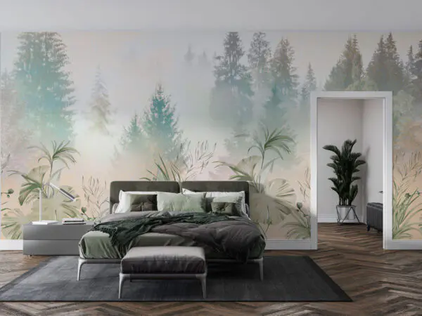 Wall mural Misty mountains and trees at sunrise