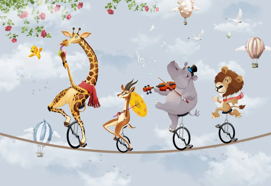 Transform any child’s space with this delightful mural featuring a hippo serenading everyone with a violin! Picture the joy of watching a giraffe and a lion, both on unicycles, joining in on the fun. It’s a whimsical scene that sparks imagination and laughter. Ideal for bedrooms or play areas, this mural can easily brighten any dull wall, giving it a splash of character. Just imagine little ones giggling as they tumble into an adventure every day—who wouldn’t want to wake up to that joyful chaos? It’s a perfect touch to inspire creativity and joy!