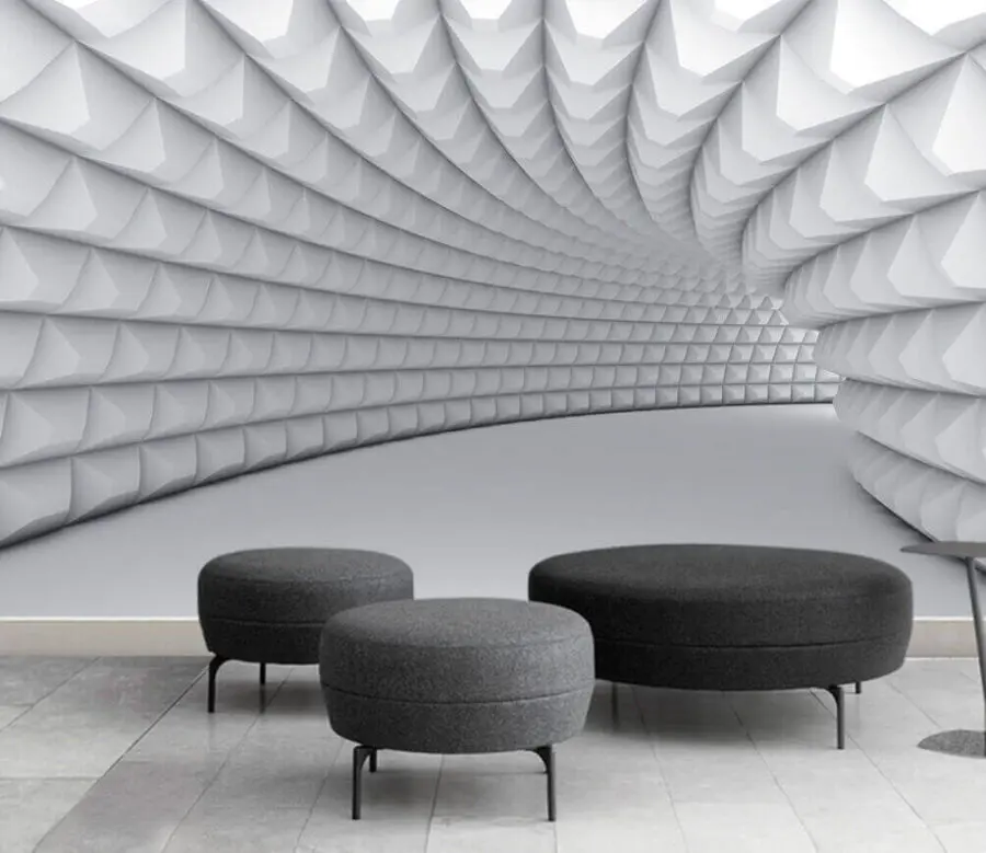 Step into a mesmerizing world with this futuristic geometric tunnel mural. Imagine transforming a plain wall into an immersive journey—where every glance feels like diving into a wave of sharp angles and smooth curves. It’s like getting lost in a dream where everything has shape and purpose. Perfect for a lounge or creative space, this design sparks conversations and inspires. Picture friends admiring it while sipping coffee, or just daydreaming about other realms. It effortlessly adds depth and a playful vibe, inviting everyone to take a closer look, and maybe a selfie or two!