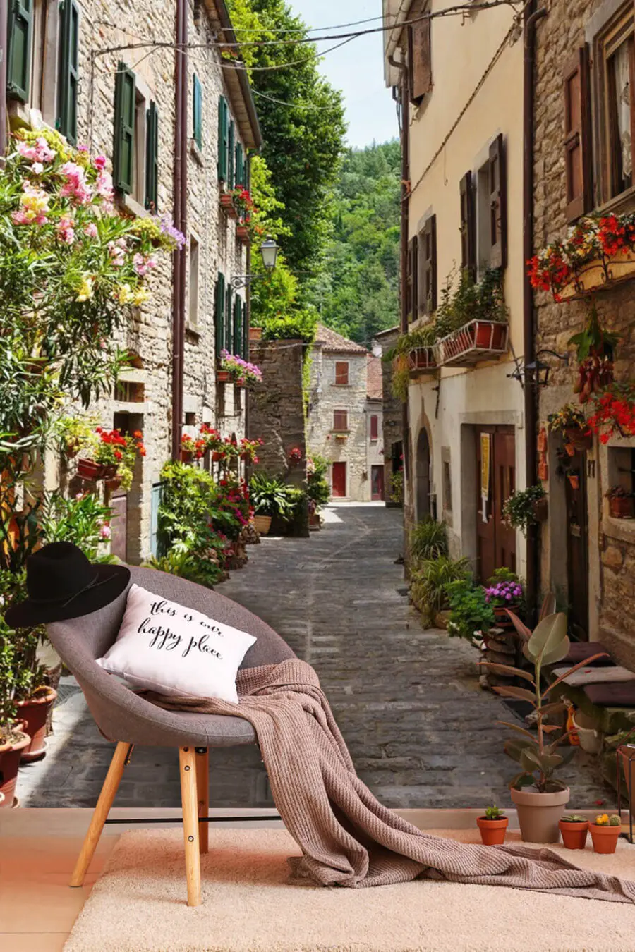 Step into a dreamy, sun-kissed alley with “Wall Murals Charming Alley with Vibrant Flowers.” This mural brings the charm of a quaint European street right into your home—imagine those delicate flower pots bursting with color, lining cobblestone paths. The greenery just seems to pop, doesn’t it? Perfect for anyone needing an escape from the daily grind, this mural adds a splash of nature-inspired beauty to any room. Picture reading a book in your new cozy corner as the “street” stretches out—it’s like a mini-vacation without the hassle of packing! Add this touch of tranquility and let the vibrant blooms brighten up your world.