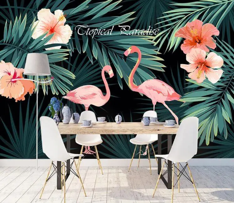 Brighten up a space with this charming wall mural featuring a delightful duo of pink flamingos surrounded by vibrant tropical flowers. Imagine walking into a room where the lively colors instantly transport you to a sunny paradise, where worries melt away like an ice cream cone in the heat. The lush greenery almost whispers sweet nothings of nature, creating a cozy vibe perfect for unwinding after a long day. Whether it’s in a living room, a kid’s room, or even a playful office, this mural doesn’t just decorate—it brings a cheerful spirit that’ll make anyone smile!