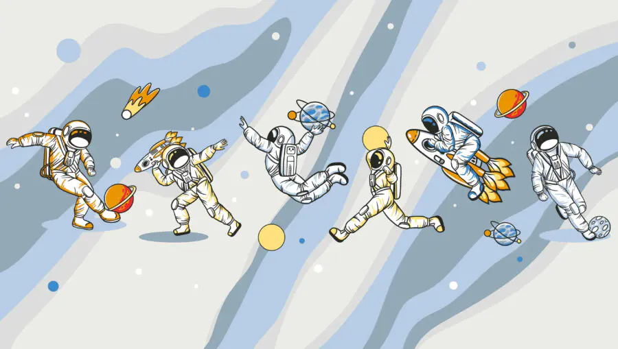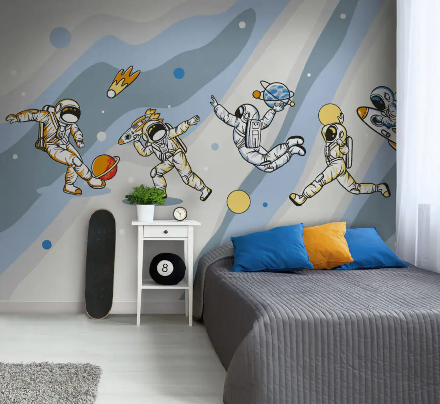 Check out this seriously cool wall mural—”Cartoon of an astronaut with a rocket on his head.” It’s like a comic strip come to life, perfect for adding some fun and adventure to any room. Imagine having this in a kid’s bedroom or a game room…the little details, like the astronauts dancing around planets, just make you smile. Plus, it totally sparks the imagination—who wouldn’t want to dream about space travels and rocket ships? It’s fun, quirky, and a bit out there, just like every good adventure should be. It’s a super fun way to make a space creative and lively!