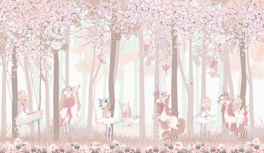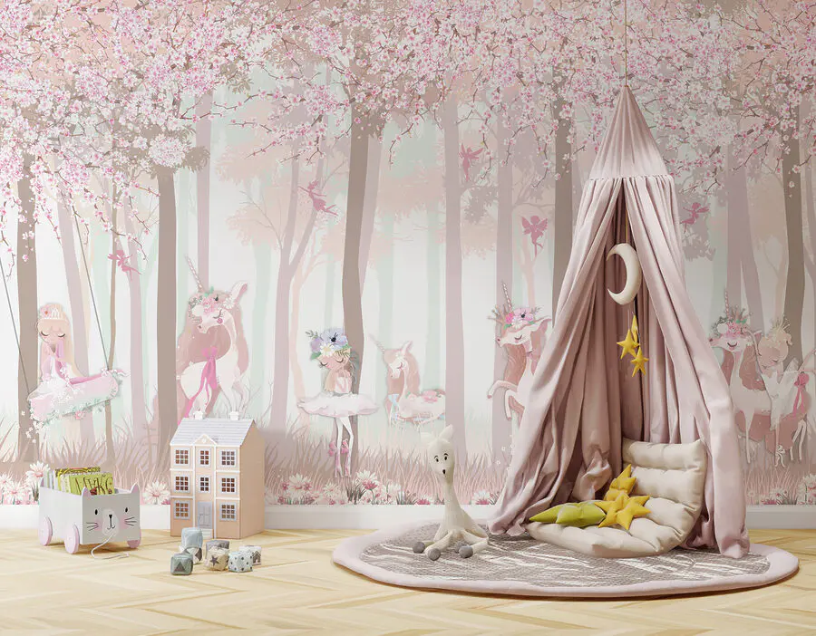 Imagine stepping into a fairytale every time you enter the room! This stunning “Wall Murals Cartoon of a Ballerina” is perfect for creating a dreamy nursery or adding a touch of whimsy to your daughter’s room. The gentle pastel hues and magical forest scene, complete with elegant ballerinas and graceful unicorns, make it feel like you’re wandering through an enchanted woodland.