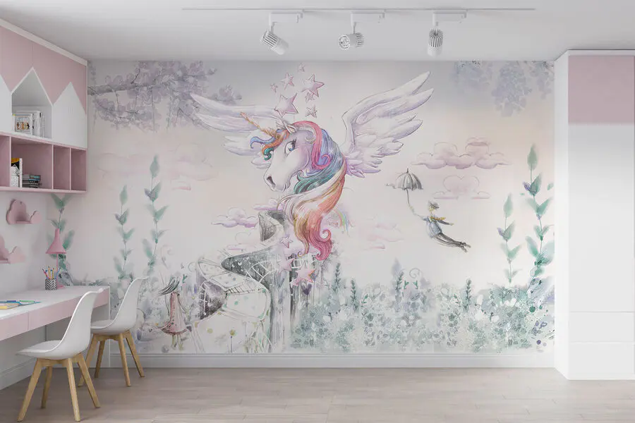 Looking for a splash of magic in your child’s room? Check out this “Unicorn with Wings and Rainbow Hair” mural! Imagine waking up to a scene straight from a fairy tale – a whimsical unicorn with flowing pastel rainbow hair, surrounded by soft clouds and twinkling stars. It’s like every child’s dream, painted on their wall! This mural fits beautifully in nurseries and young kids’ rooms, making it feel like they’ve leapt into their favorite storybook. Sweetly understated, yet totally enchanting – it sparks joy and endless stories. Perfect for a little one’s wonderland or any unicorn lover’s haven! 🌈🦄