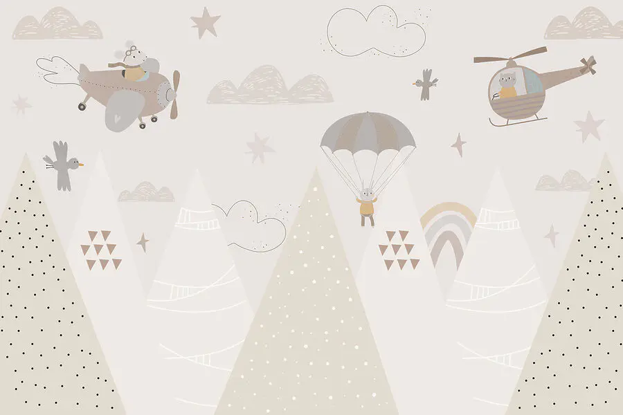 Subtle, pastel colors and playful details add magic everywhere you look – clouds, stars, and even a parachuting bunny! You can almost hear the soft whoosh of the wind and the cheerful chirps of birds. It’d be perfect for sparking little imaginations, turning bedtime stories into grand tales of aerial escapades.