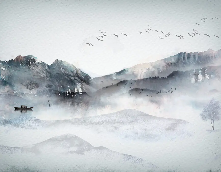 Imagine stepping into a room and being greeted by a serene group of birds soaring across a dreamy sky, drifting high above a foggy forest landscape. This watercolor mural isn’t just art—it’s an experience. The calming mist, soft hills, and distant mountains—like a gentle whisper of nature. It’s almost like you can hear the whisper of trees and feel the cool, crisp morning air brushing against your skin.