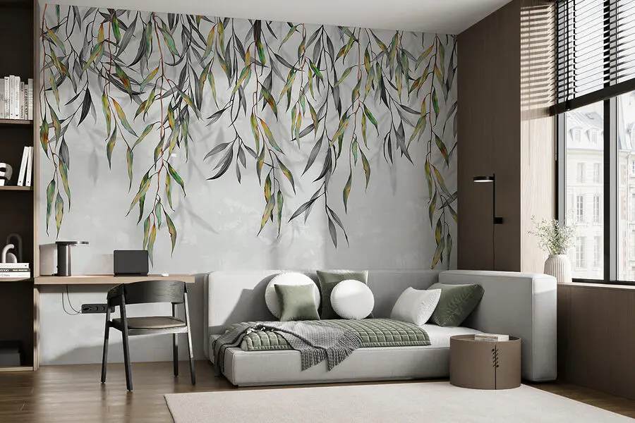Transform a plain wall into a serene escape with these lovely willow leaves dancing in the breeze. Imagine walking into a room where the subtle sway of nature brings calm vibes—a perfect backdrop for cozy chats or quiet reading. The soft colors blend beautifully, inviting warmth and a touch of the outdoors inside. It’s like having a little piece of a peaceful forest right in your living space. Friends might even confuse it for a clever escape to your favorite park. With this mural, every day can feel a bit like a sunny stroll among the trees.