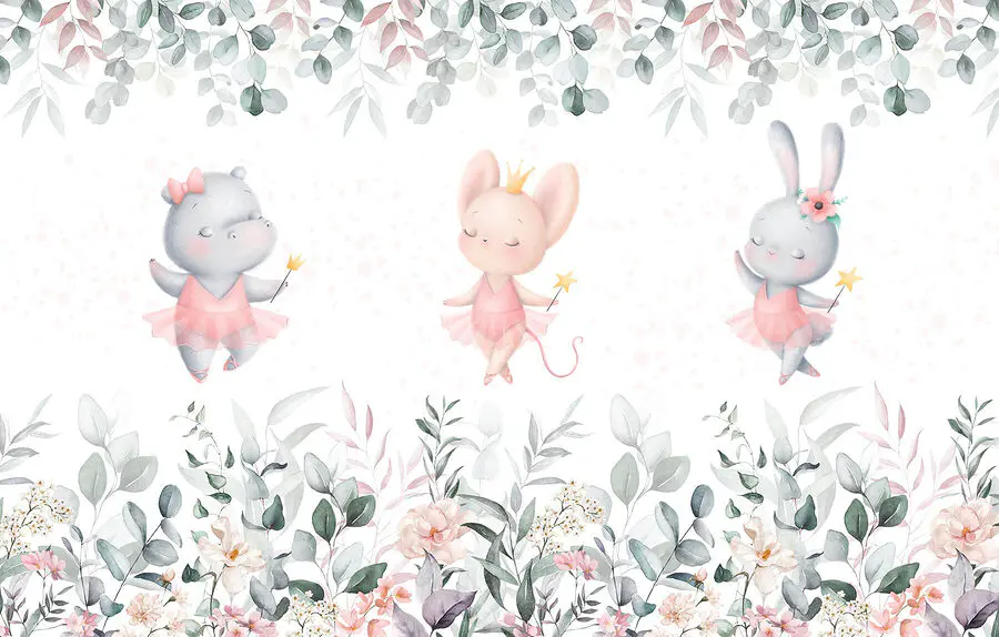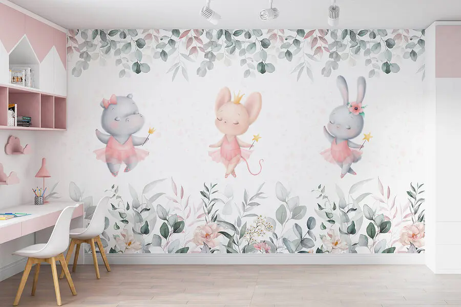 Transform any child’s space into a whimsical wonderland with this delightful mural featuring adorable animals in pink tutu skirts! Picture a happy hippo, a charming mouse, and a sweet bunny, all dancing under a shower of flowers. It’s like a joyful ballet without the need for toe shoes. This mural isn’t just decor; it sparks imagination and giggles, making it perfect for playrooms or nurseries. Imagine a little one twirling around, inspired by the cuteness on the walls, feeling like a superstar. Who wouldn’t want to join that fun? It’s a sweet reminder of childhood magic, sprinkled with a touch of floral charm. Perfect for those looking to bring a smile to any room!