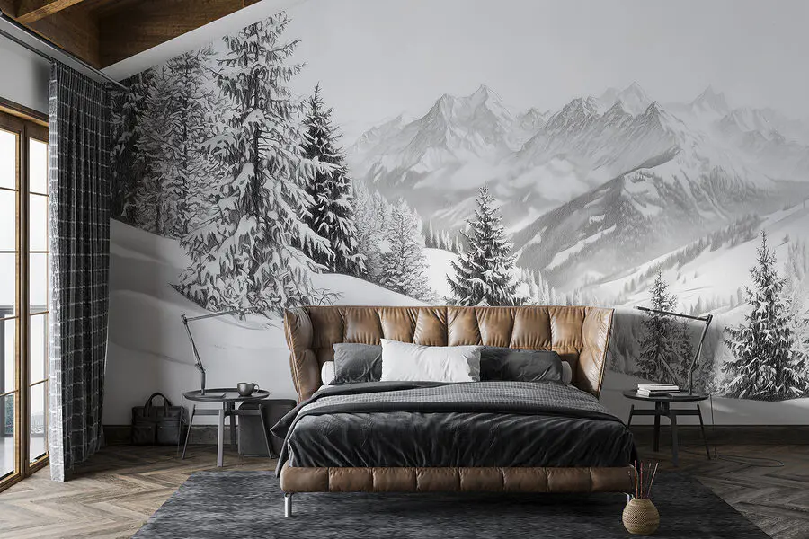 Transform any room into a serene winter escape with this stunning mural of snowy mountains and majestic trees. Picture yourself cozying up with a hot drink, gazing at the breathtaking landscape that feels just a whisker away. The tranquil whites and soft greys evoke a calmness that wraps around like a warm blanket—perfect for those chilly nights. Add a touch of wilderness to your walls, and let your space breathe fresh mountain air. Ideal for nature lovers and daydreamers alike, this mural invites peaceful thoughts and a sense of adventure, even from the couch.