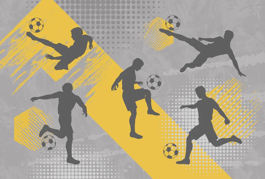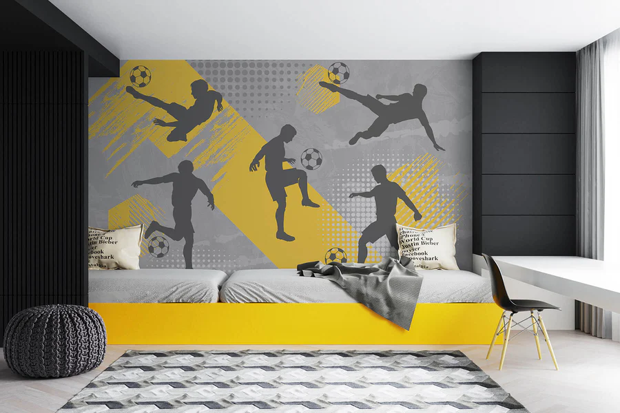 Transform a plain wall into a dynamic scene with this vibrant mural of men playing football. It’s like having your own mini stadium right at home. The silhouettes, full of energy, capture that perfect moment of a kick, a jump, and all the excitement of the game. Imagine stepping into your room and feeling that rush of adrenaline, like you’re about to join the players on the field. With striking yellows against soft grays, it adds a dash of cheer, making any space feel alive. Perfect for sports enthusiasts, or anyone who enjoys a little zest in their decor. Get ready to kick boredom to the curb!
