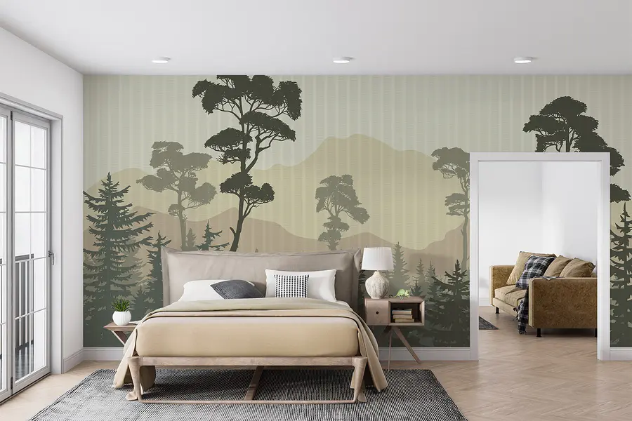 Transform any space into a serene escape with this “Wall Murals Landscape of Trees and Mountains.” Picture it: a cozy living room or a tranquil office, bathed in soft hues of nature.