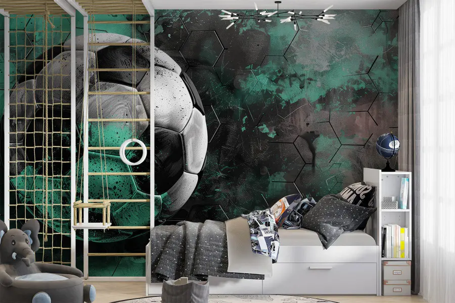 Transform your space with this stunning wall mural featuring a soccer ball splashed against a vibrant green and black backdrop. It’s like bringing the thrill of the game right into your living room, minus the cleats on the carpet! The bold colors and dynamic design could easily spark some friendly debates over who’s the best player—just don’t forget the popcorn for those match-day moments. Perfect for sports lovers or anyone looking to add a playful twist to their decor, this mural encourages lively conversations and maybe even a little daydreaming about that perfect goal. Whether it’s in a game room, a kid’s room, or even the office, it’s bound to uplift spirits and make those walls come alive! Who knew soccer could be so stylish?