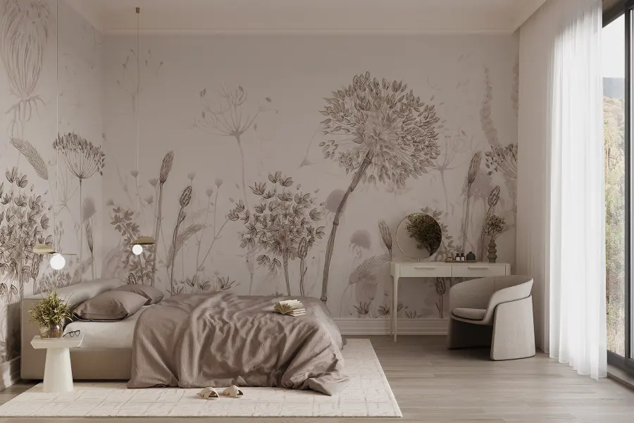 Transform your space with this stunning wall mural featuring a delicate dance of flowers and plants. Imagine waking up surrounded by soft, muted blooms, each telling a story of nature’s quiet charm. There’s something so soothing about these intricate designs—they whisper peace and invite calm. Perfect for a cozy reading nook or that blank wall begging for a touch of personality. Friends may walk in and think, “Wow, did a botanical garden just pop up in here?” It’s a breath of fresh air without the maintenance. Let those little floral vibes brighten your day!